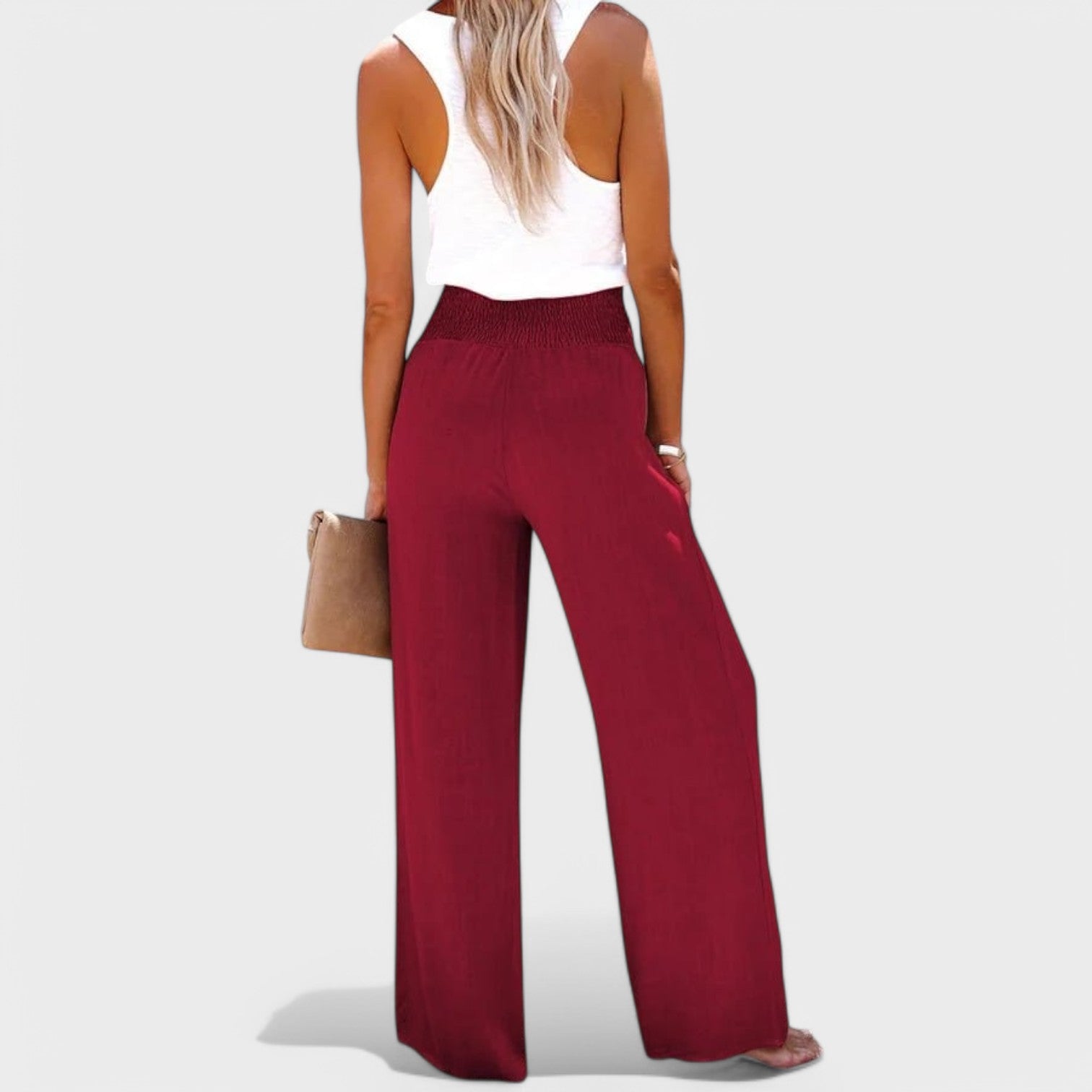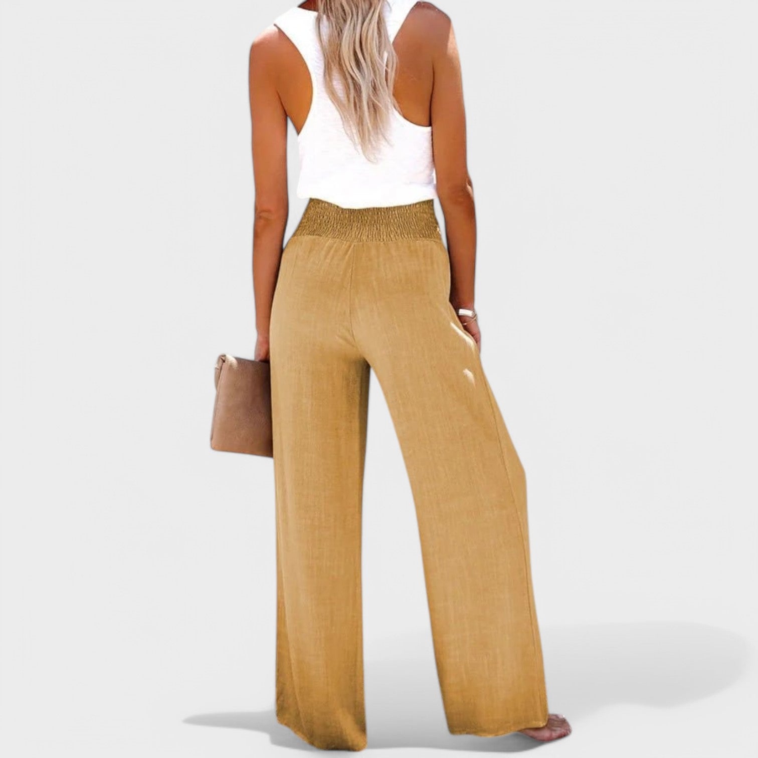 These women's high-waisted linen pants are the definition of relaxed elegance. With a fluid cut and lightweight fabric, they are ideal for warm days, providing comfort without compromising style. The smocked elastic waistband with front button detail enhances the silhouette in a natural and modern way. Perfect for pairing with crop tops or flowy blouses, these pants are a key piece for versatile and sophisticated summer looks.