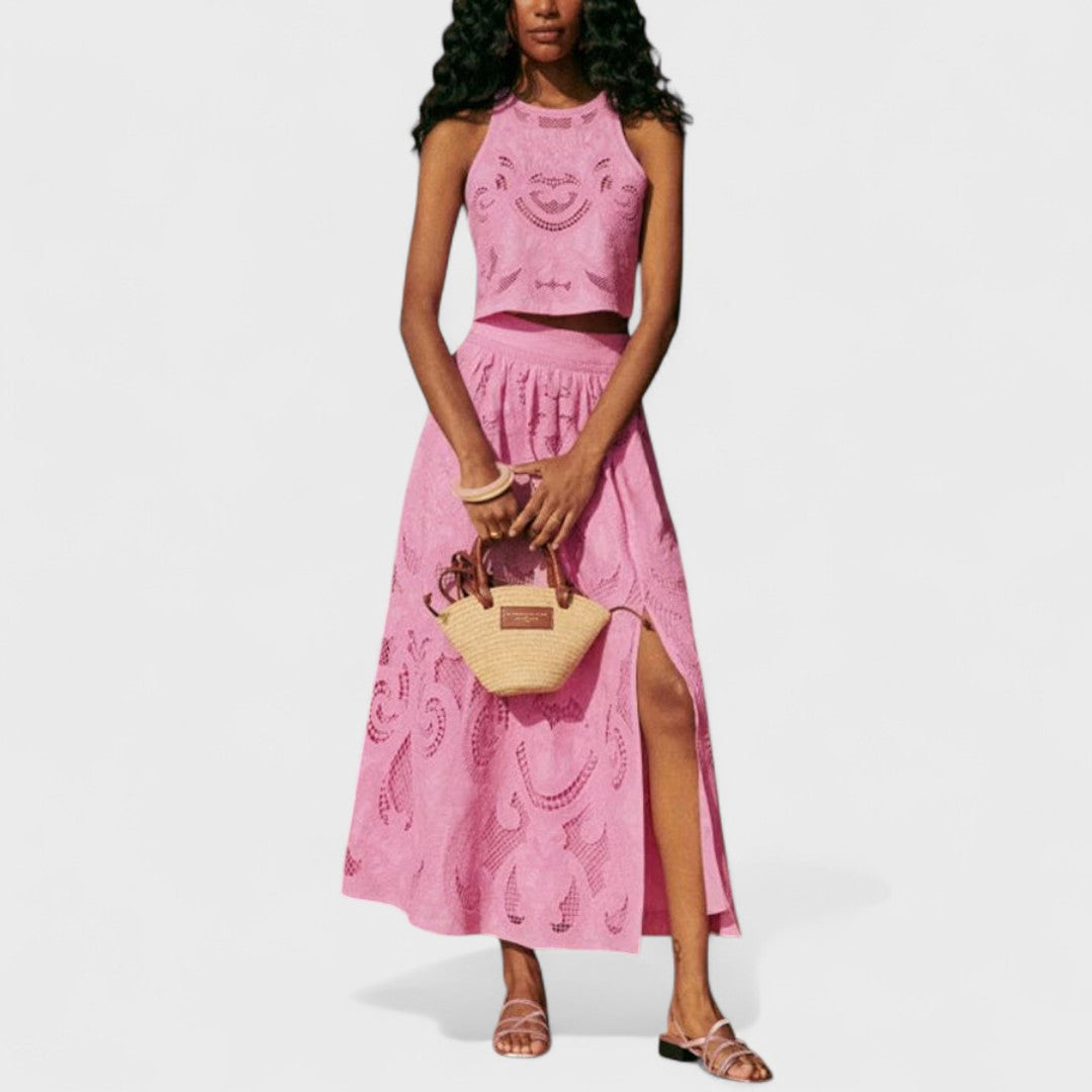 Avec sa dentelle délicate, son top à fines bretelles et sa jupe fendue taille haute, cet ensemble est chic, léger et féminin. Portez-le pour une promenade estivale, un apéritif au soleil ou une occasion spéciale : vous serez à la fois détendue et à l’aise. Les pièces peuvent se porter ensemble ou séparément, selon vos envies.