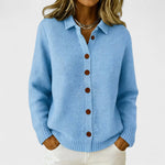 The Annika cardigan is the ideal piece for those seeking the perfect mix of comfort, warmth, and sophistication. Made from a soft and pleasant fabric, it offers a cozy fit that accompanies you during the cooler days. The design with collar and buttons adds a simple elegance that enhances any outfit, from casual to more polished.