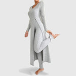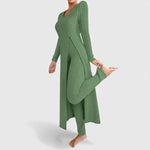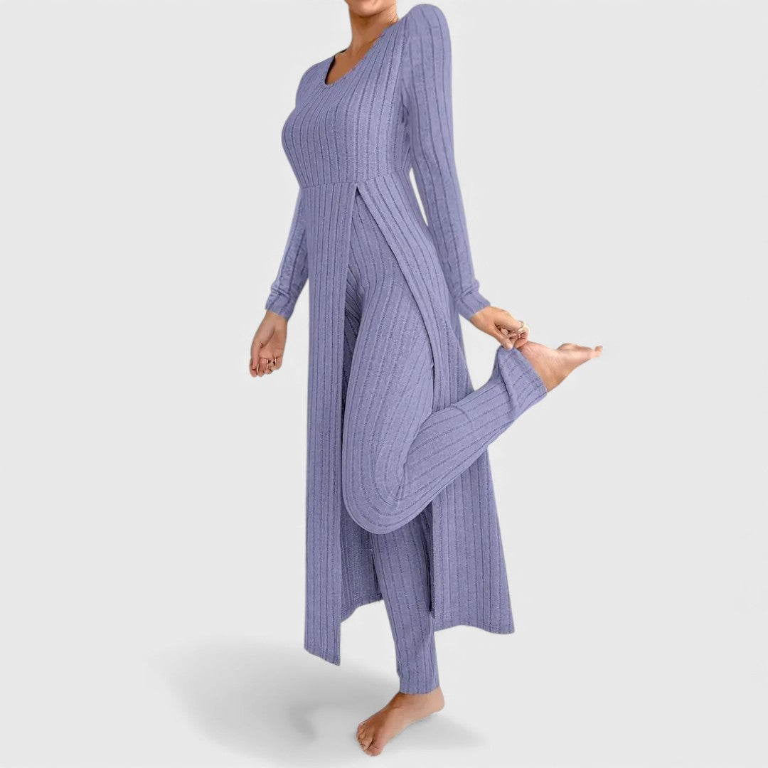 This ribbed set is the perfect blend of comfort and style. Made from a soft knitted fabric, it wraps the body lightly and ensures freedom of movement while maintaining a sophisticated look even during moments of relaxation. The modern design with a long cut and fitted pants enhances the figure, making it ideal for both home and casual outings.